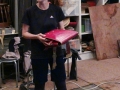 The first picture shows the recording of sound effects for footsteps on the ice, while the second one shows the school bag they used to simulate the sound of rubbing leather.