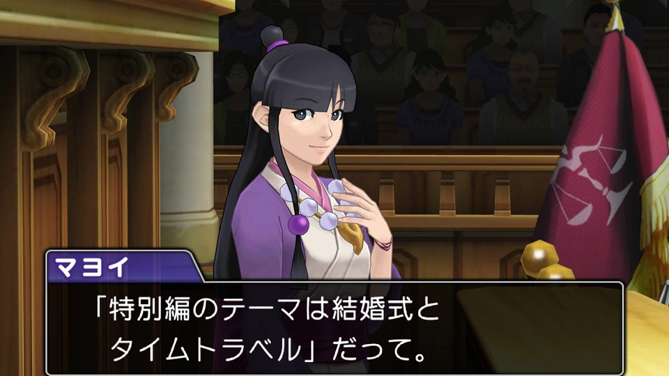 The plot of this DLC involves a wedding ceremony, but also time travel… some rather unusual themes for the Ace Attorney series! You can get a preview by watching the video below, which is a special Court Skit introducing the case. It includes some animated cutscenes, which show the bride “rewinding time”, but also Larry Butz getting in trouble with security.