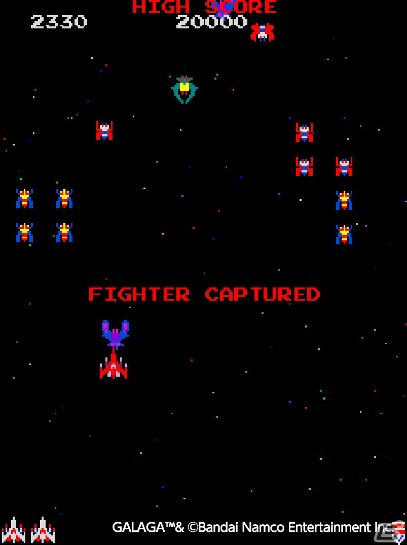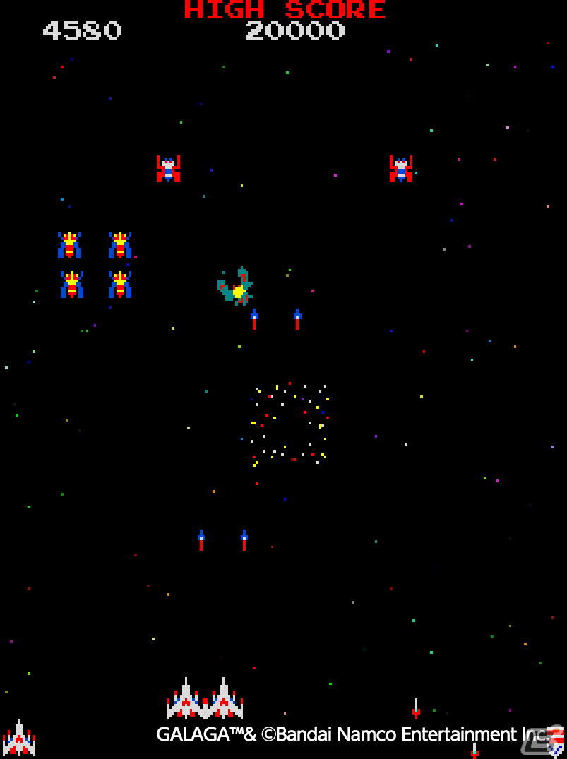 [ngg src=”galleries” ids=”28094″ display=”basic_thumbnail” order_by=”pid”]“GALAGA” is a shooter released by NAMCO (Bandai Namco Entertainment) in 1981. It is a sequel to GALAXIAN. This title has a new model of FIGHTER with rapid-fire missiles facing off with vicious aliens! It also lets you rescue FIGHTERS captured by BOSS GALAGA tractor beams to form a Dual FIGHTER for linked dual missile fire.