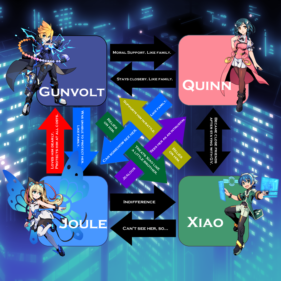 Here’s two charts explaining the relationships between Gunvolt / Copen and the various characters revealed so far, along with some screenshots/artworks of the new characters: