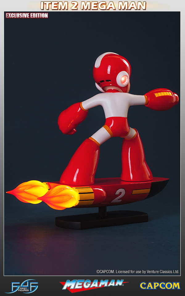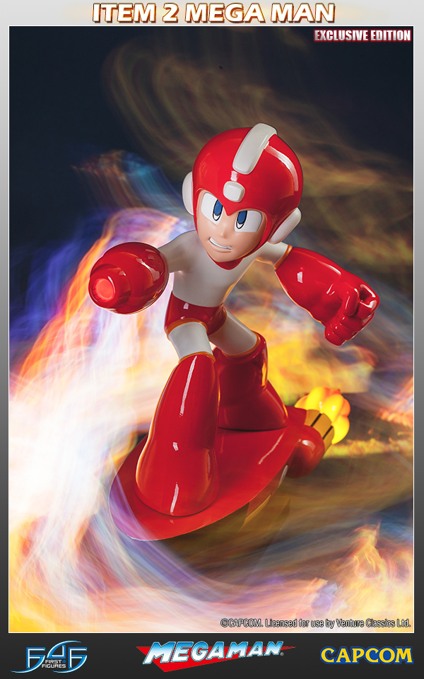 First 4 Figures is proud to present Item #2 straight from the classic Mega Man 2 by Capcom! Mega Man is portrayed in his red and white armor, cruising on the board as he prepares a shot to an oncoming enemy with his Mega Buster. Cast in high quality polystone and painted by hand, every detail of the classic sprite has been captured and realised. From the base to the top of his head, Mega Man measures 13 inches tall.