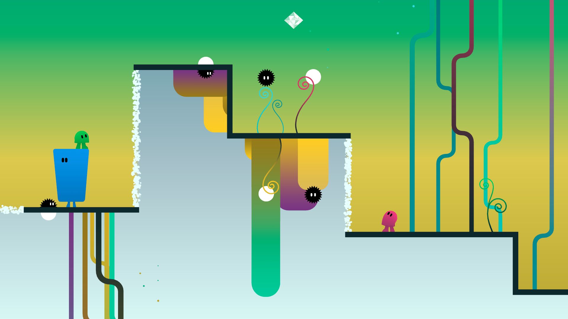 ibb & obb is a two player cooperative game set in a puzzle filled world where gravity goes both up and down. You can only succeed by working closely together. Fall up and jump down through 15 levels filled with double gravity puzzles and discover 8 hidden worlds that will test your new non-Newtonian skills to the max. All levels have their own unique music composed by Kettel, known for his warm melodic electronica.