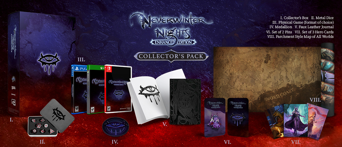 • Neverwinter Nights: Enhanced Edition Collector’s Pack ($99.99): The 2002 Computer RPG of the Year and all its DLC deliver 10 standalone D&D-based adventures featuring co-op and online multiplayer. Physical items include a Neverwinter Nights “Eye” Medallion, Set of 2 Pins, Engraved Metal Dice Set, Parchment Style Map, Faux Leather Journal featuring the Neverwinter Nights Eye emblem, and 3 Hero Cards of Deekin, Aribeth and Valsharess.