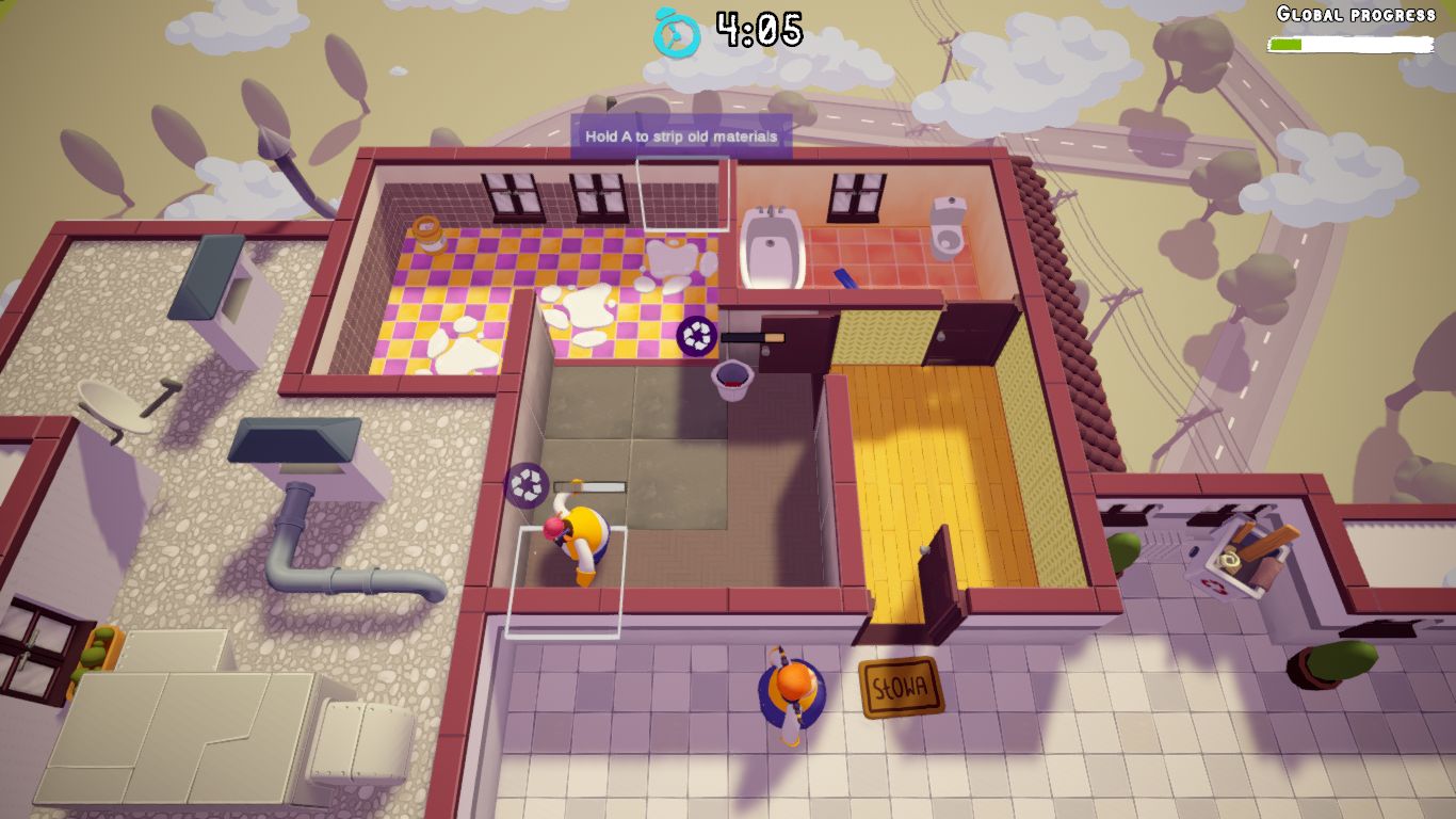 The players’ task is to renovate apartments in a mysterious skyscraper. Remember to follow their instructions and plans! Tear down wallpapers, destroy walls, break down doors and lay colorful, dappled carpets and panels – but don’t forget about the time limit! Tools Up! Is playable with up to 4 players is couch co-op.