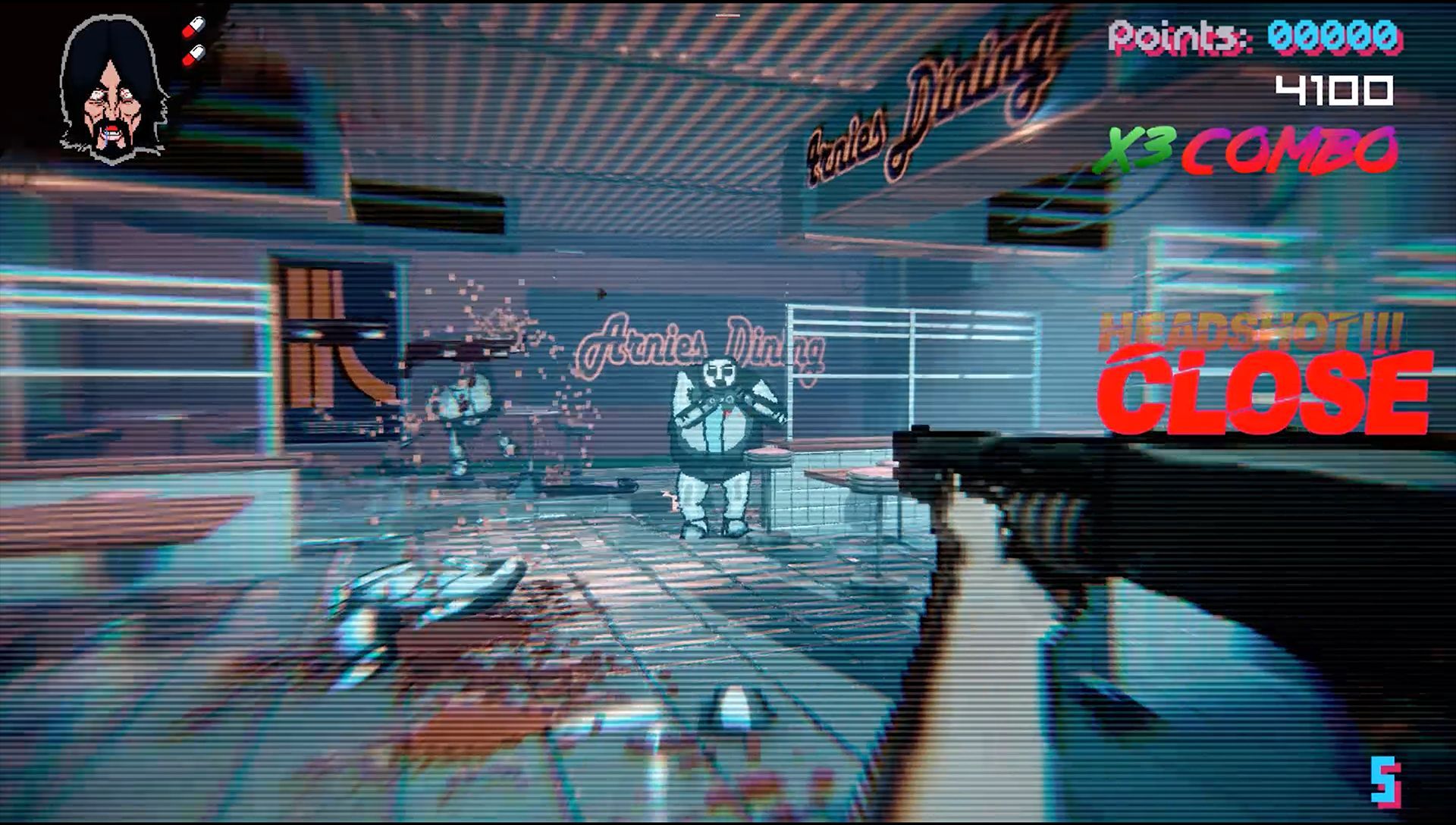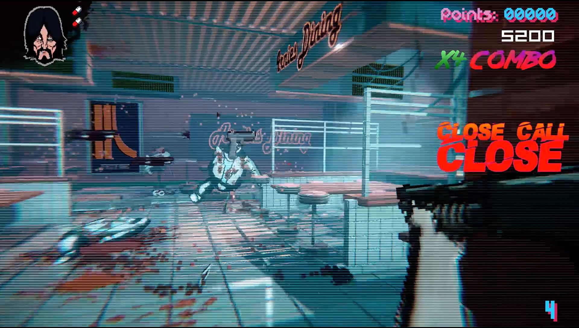 Self-medicated, low on ammo with no time to reload, and facing an enemy reloading right in front of you? Dash up to him and smack him with a self-medicated kick to send him flying. Dodge incoming bullets for a score multiplier, and rip enemies to shreds with your huge arsenal of weapons, including several different shotguns, a minigun, a berretta, a katana, and even a lead pipe.
