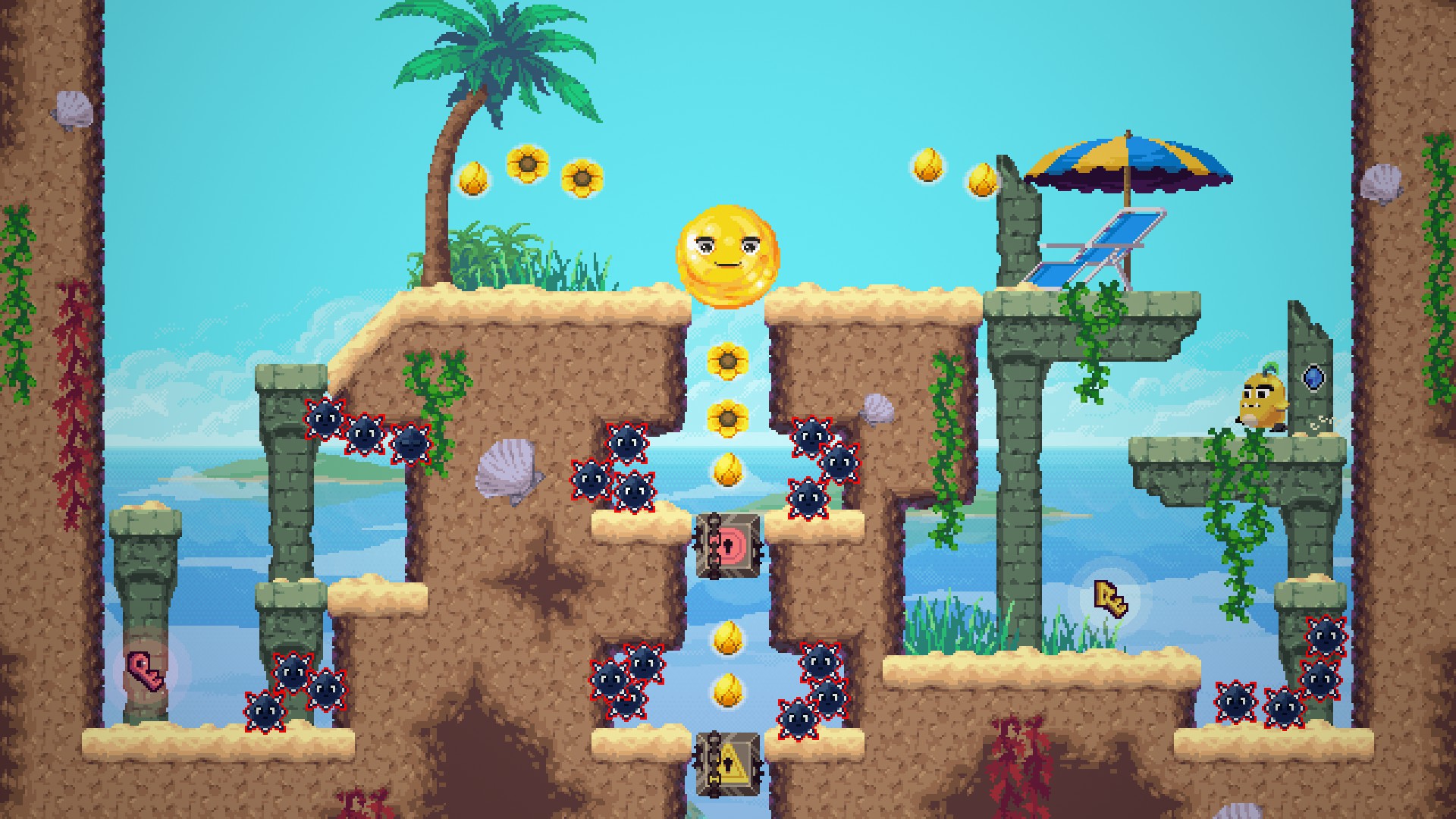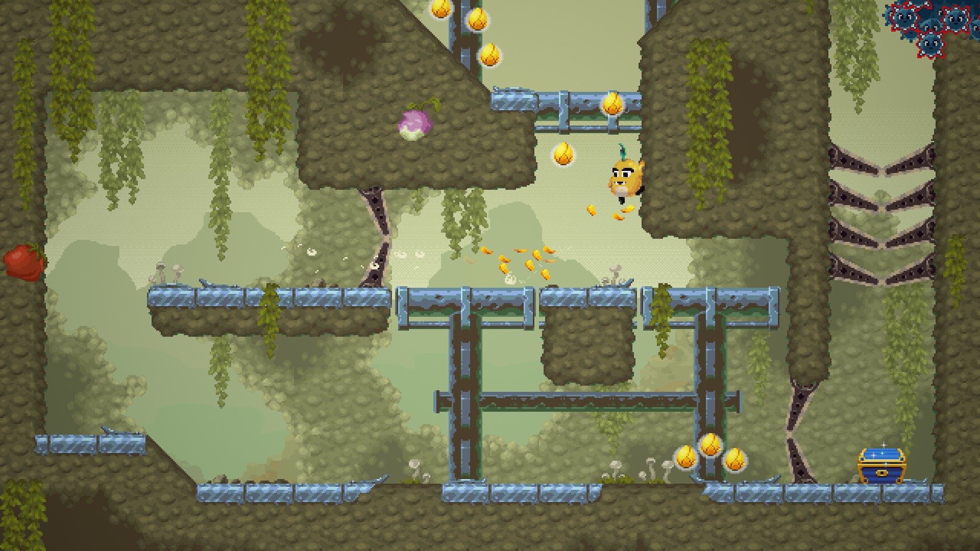 In Wunderling, a retro video game henchman (the title character) is revived and given the power to jump by its master – the evil sorceress Kohlrabi. Seeking to tighten her hold on the Vegetable Kingdom and defeat its hero (the Carrot Man), she tasks the Wunderling with protecting her prisoner – the lovely Princess Pea. Unable to stop or change direction at will, planning ahead becomes a must. The Wunderling’s special abilities will be essential to navigate the game’s lengthy scrolling levels!
