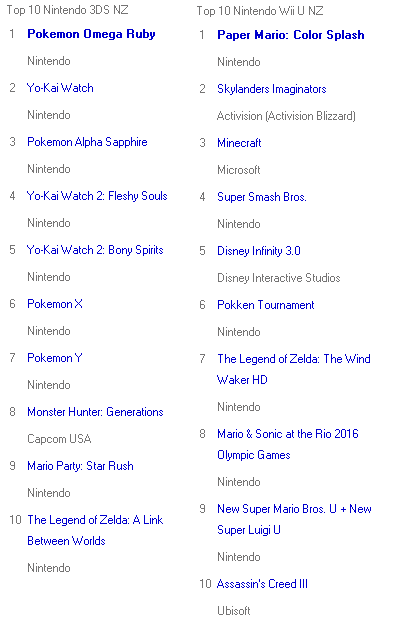In New Zealand, the only games on Nintendo platforms is Minecraft, which was the 3rd best-selling game on the platform (behind Skylanders Imaginators and Paper Mario: Color Splash). On Nintendo 3DS, the best-seller was Pokémon Omega Ruby / Alpha Sapphire, with Yo-kai Watch 2: Bony Spirits / Fleshy Souls actually landing below Yo-kai Watch!