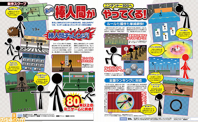 This week, Famitsu will revealed a new downloadable game for the Nintendo 3DS, from Bandai-Namco. The game in question is Bou Ningen Challenge (lit. Stickman Challenge!), and is apparently based on a popular game. It will feature over 80 mini-games. According to the magazine, development is 99% complete, which means that the game will be released pretty soon.