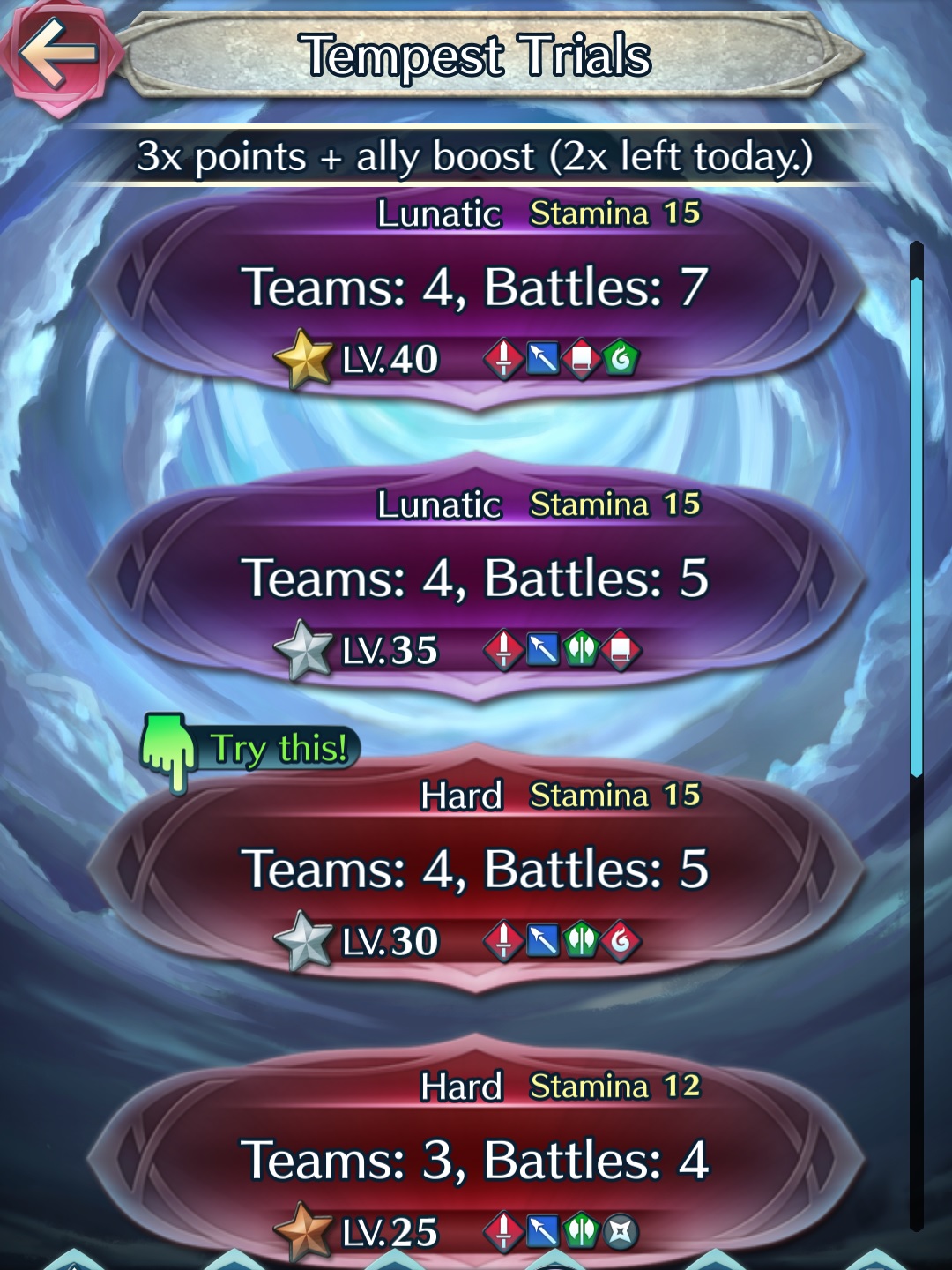 You can access Tempest Trials+ via the Battle section of the app, and tapping on the “Events” icon. You need 10 Stamina units to play (instead of 15, previously).