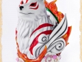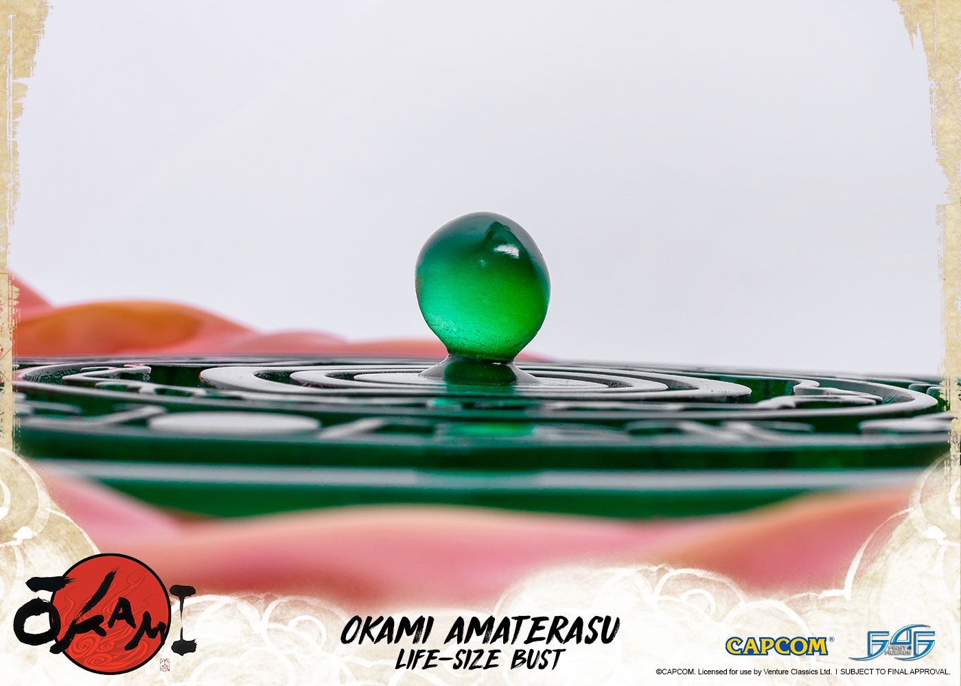 This is the Exclusive edition of Okami Amaterasu Life Size Bust where animated LED’s are included throughout the flames surrounding the Solar Reflector and Amaterasu’s body giving off an illusion of a fire effect. The Orb encasing Issun where he is hopping onto Amaterasu also glows brightly truly bringing the entire piece to life.