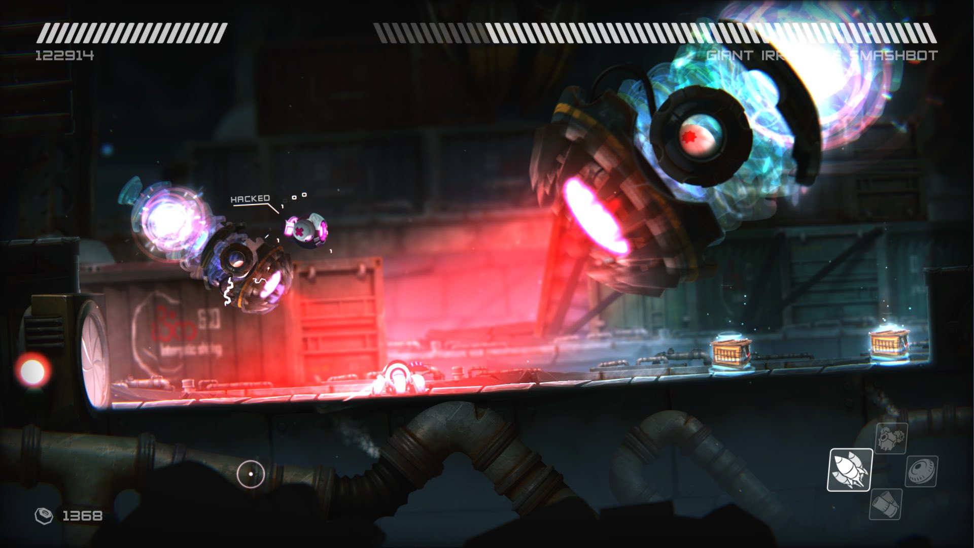 Here’s two more screenshots for RIVE, showcasing a boss battle and one of the on-rail shoot’em up sections: