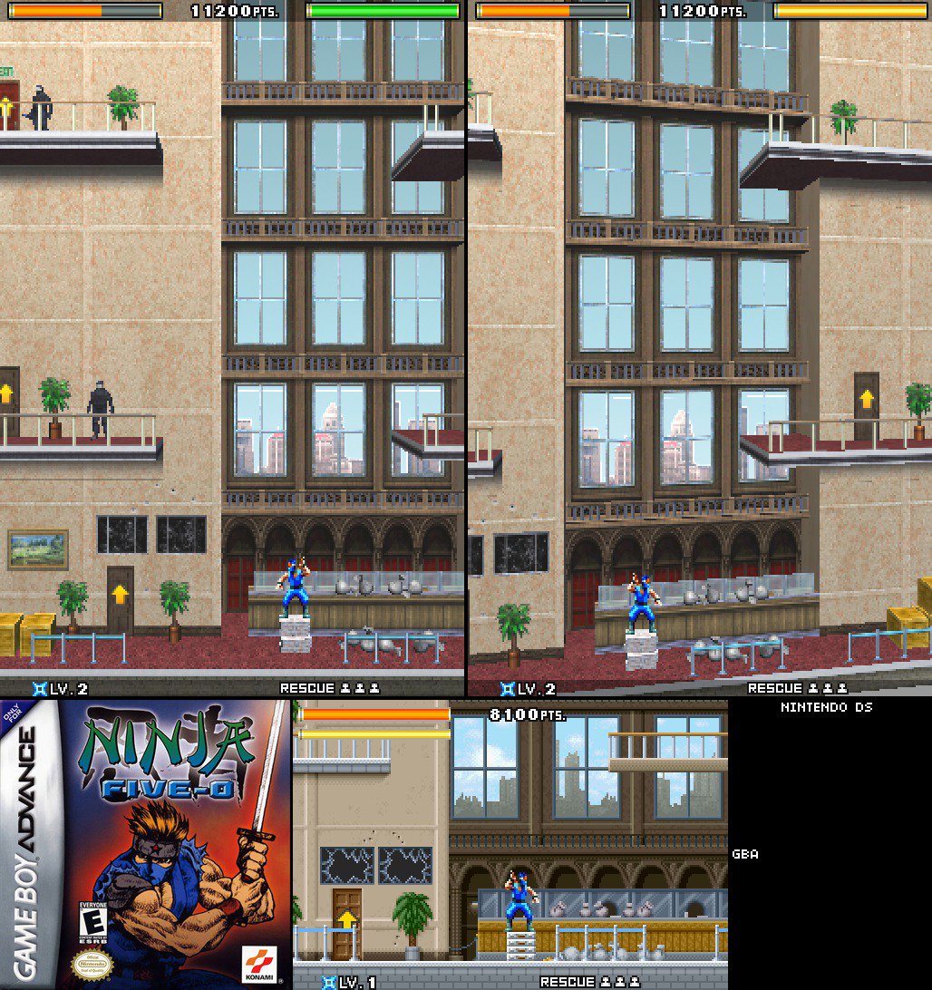 Here’s a picture that shows a (rejected) pitch for a 2.5D port of Ninja Five-O from the GameBoy Advance to the Nintendo DS:
