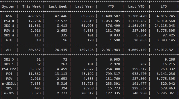 This week, the Nintendo Switch sold roughly 50 000 units, which is slightly better than Week 30. It looks like the console isn’t going to leave that 50 000 units/week range any time soon: that’s where it’s been hanging for a little while now. While it’s definitely good to see sales remain stable, it’s clear the Nintendo Switch can sell much more than that; unfortunately, without a strong system seller this year, like Splatoon 2 in 2017, it doesn’t look like sales are going to rise much higher during the Summer holidays season.