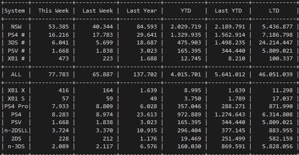 This week, Nintendo Switch sales saw a noticeable increase with 54 235 units sold: that’s over 10 000 units more than during Week 44, which is a really positive thing given the complete lack of new releases in the Top 20 from Media Create. Of course, sales are still down Year on Year (the console sold about 79 000 units during Week 45, in 2017), but it should be the last time this happens this year.