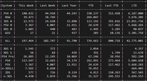As for the Nintendo 3DS, sales dropped evern further this week, with only 11 313 units sold. Not surprising given the complete lack of new releases, and the fact the handheld is soon approaching its 7th Anniversary. So far, sales in 2018 are roughly 50% down Year on Year. In a couple of months, the Nintendo 3DS will reach the 24 million threshold.