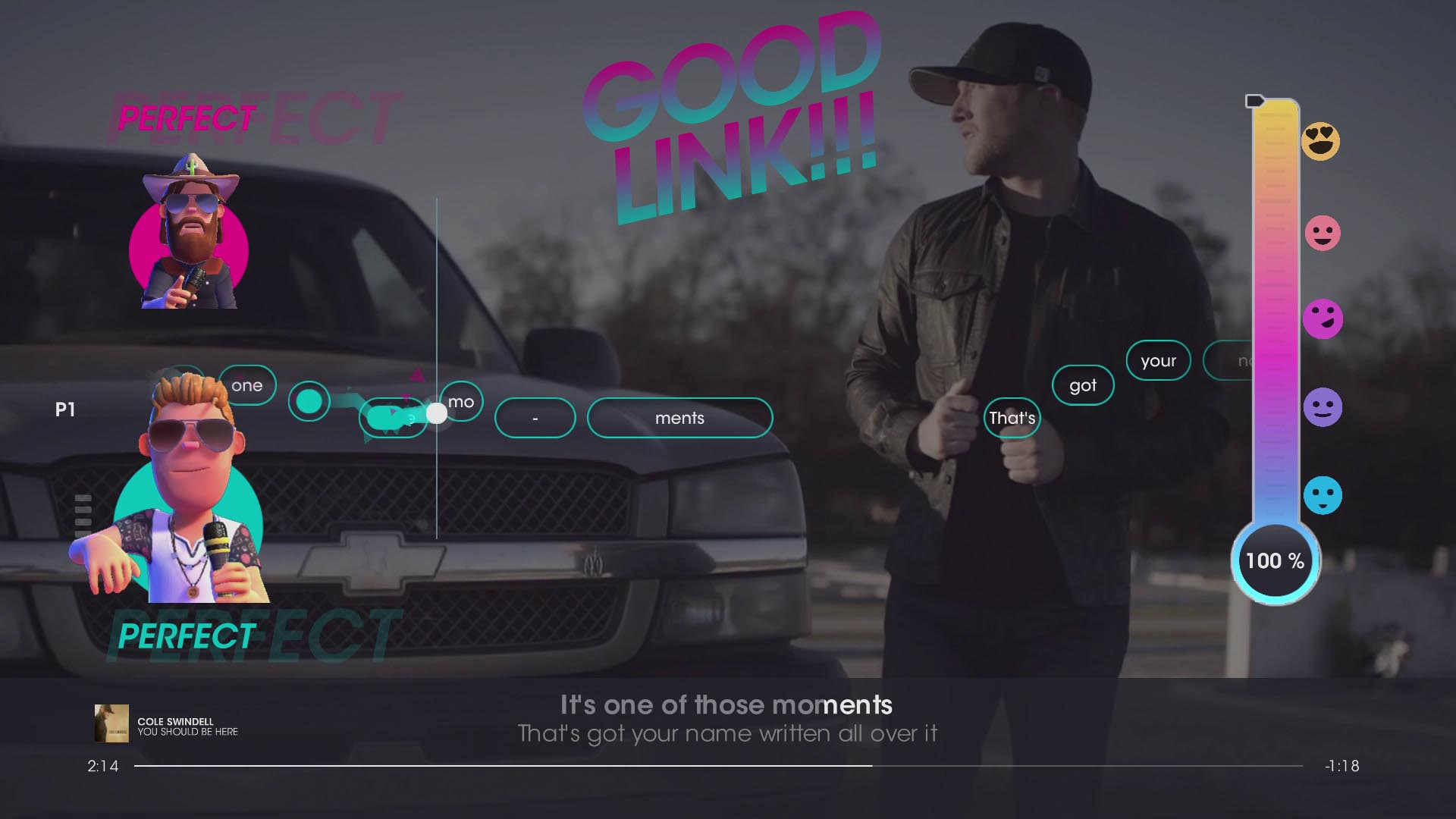 - Find your perfect match in Feat mode. Team up with a friend or one of the in-game artists to blend your voices and increase your prestigious “compatibility score.”