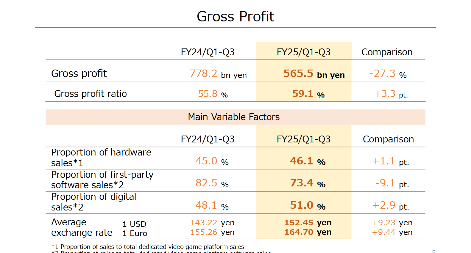 - Digital sales: 245.8 billion Yen (+85.9 billion Yen during Q3), a 29% drop Year on Year mainly due to a decrease in the sales of digital version of retail games;