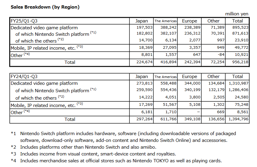 - Mobile and IP related business: 49.7 billion Yen (+18.5 billion Yen during Q3), a 33.9% drop Year on Year due to a decrease in revenue related to the Super Mario Bros. Movie (which had a strong impact last year).