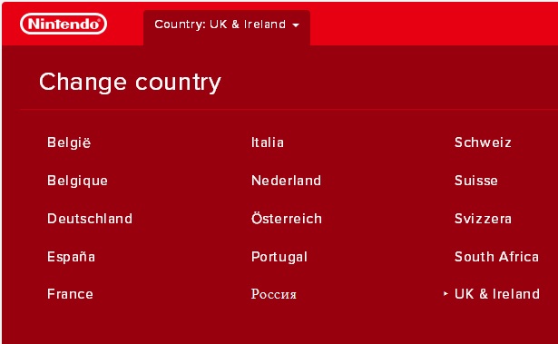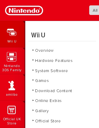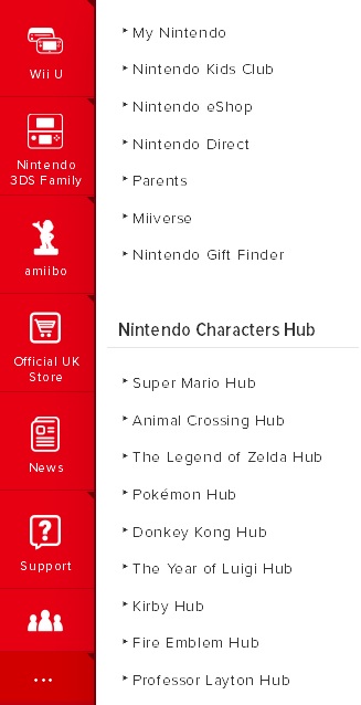 And now… everything is red. Instead of just changing the colour of the logo, Nintendo of Europe decided to turn the header and the menu completely red (as you can see in the screencaps below). The menu was also updated and condensed (you now need to click on the icons to see the sub-menus, instead of simply hovering your pointer over them), and the country selector isn’t displayed as an overlay anymore.