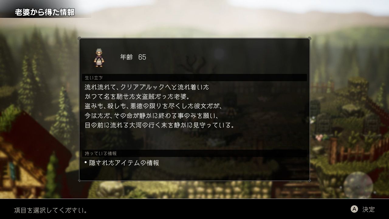 - Therion (Thief, 22 years old): he’s from the Cliffland region, and his past is completely shrouded in mystery. Members of the aristocracy and other rich people shudder at the mere mention of his name. One day, a mysterious client asks him to retrieve a rare gemstone, and so he sets off on a journey. His Path Action is Steal: as the name implies, it allows him to steal items from pretty much anyone he meets, including items usually not available in stores. He can also procure goods to certain individuals for rewards. Thanks to his Thieving ability, he can strike enemies pretty fast during battle, and is pretty good at getting the first strike with that dagger of his. He can steal HP and SP from enemies, but also lower their Attack and Defense, which is why he’s pretty useful during long battles.