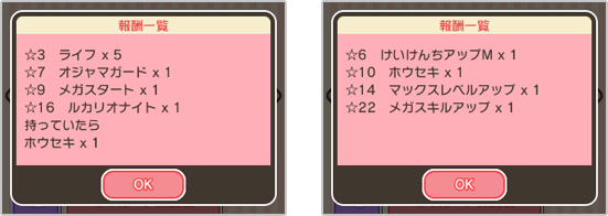 - Mission cards: special missions with objectives to complete (such as making a combo of 10 for example). Each mission has its own set of restrictions and rewards (stars). When you have a certain amount of stars, you can redeem them for items such as Mega Starts, or Mega Stones;