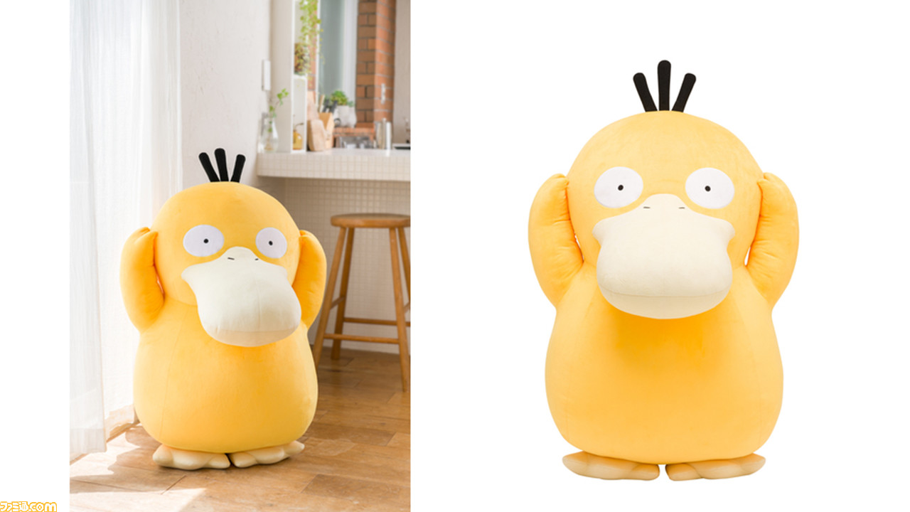 Here’s pictures of a giant Psyduck plushie (80cm), now available for pre-order in Japan (price: 30 800 Yen):