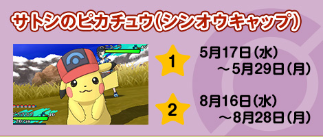 - Hoenn Cap: from May 3rd to May 15th, and from August 2nd to August 14th. Comes at Level 6, with the moves Thunderbolt, Quick Attack, Thunder, and Iron Tail;