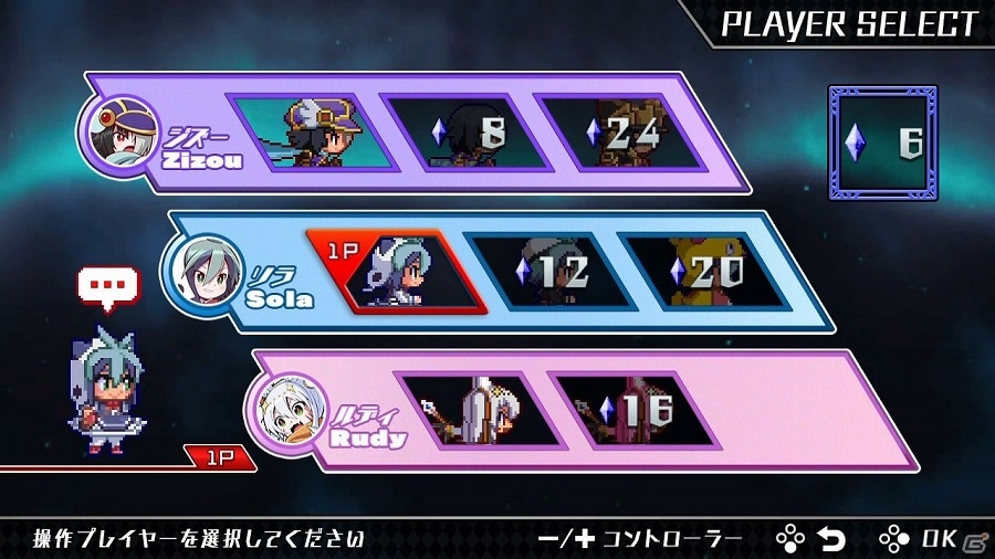 - Story Mode: only playable in Single Player. You can chose from 3 characters (Zizou, Sola, and Rudy), with various costumes to unlock, which is done by collecting crystals. Those crystals are earned when getting high scores: the higher your rank, the better the reward (with the following rank system: C, B, A, S, S+). There’s 13 stages to tackle, each one ending with a different boss;