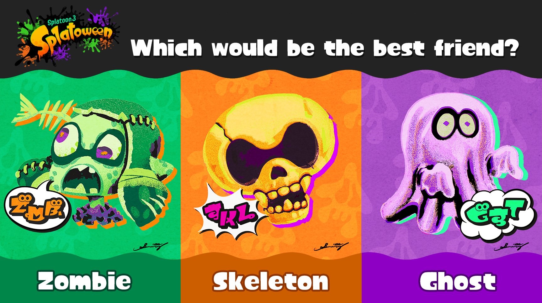 - Theme: Splatoween! Which would be the best friend? Team Zombie vs Team Skeleton vs Team Ghost!