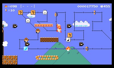 The portable version of the level creation hit features the full editor from the console original (minus the Mystery Mushroom and associated costumes), however, it does not support online sharing of courses. Instead, courses can be shared locally through wireless transmission and via StreetPass. In a new feature exclusive to the Nintendo 3DS edition, creators can share unfinished courses locally among one another and collaborate on them. These collaboration courses are marked with a special item.
