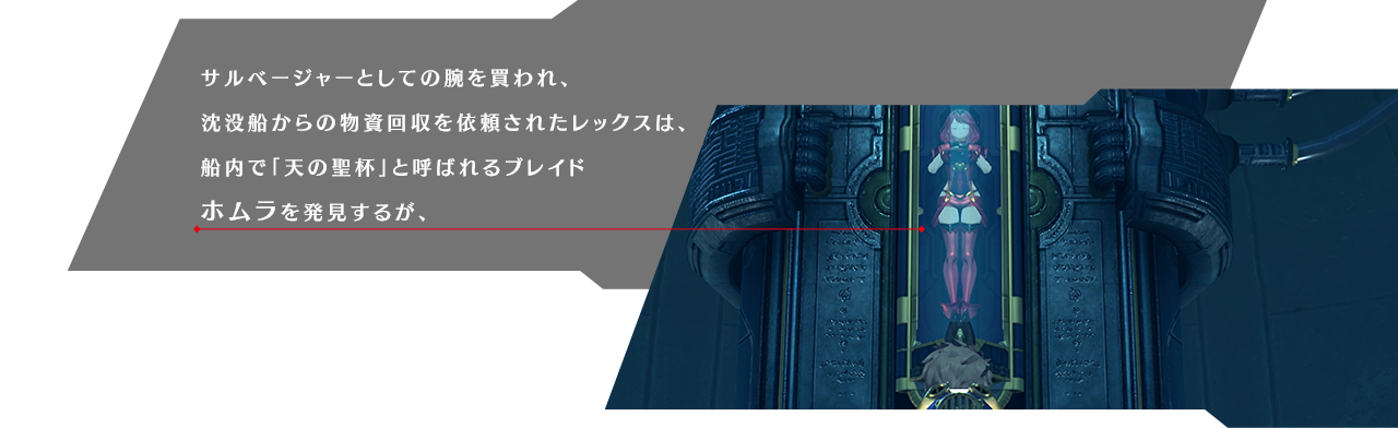 One day, he finds Pyra (a mysterious Blade) in a ship. But right after that, Jin (from Torna, a secret organisation looking to capture Pyra to further their own goals) appears and kills Rex on the spot. Fortunately for him, Pyra offers him half her life force, allowing him to come back to life. In exchange, Rex has to bring her to Elysium, the fabled paradise.